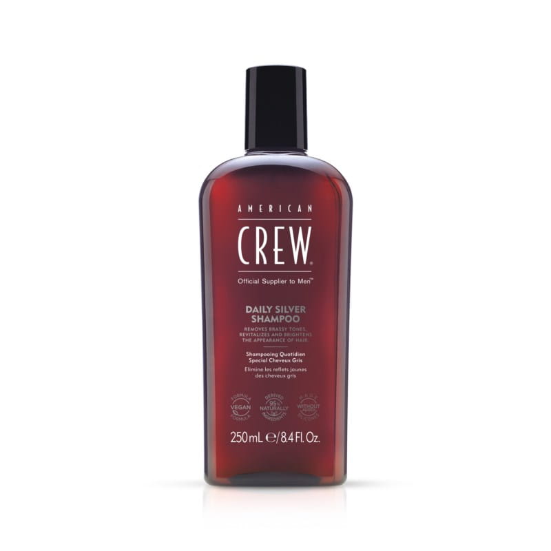 American Crew szampon Silver rewitalizuje i rozjaśnia siwe włosy. Usuwa niechciane żółtawe tony, nie obciążając przy tym włosów. Udoskonalona formuła pozwala na codzienne stosowanie szamponu, bez konieczności farbowania włosów. W 95% składa się ze składników naturalnych, które nie tylko pomaga zachować ładny kolor włosów, ale także dobrze je nawilża oraz polepsza kondycję włosa.