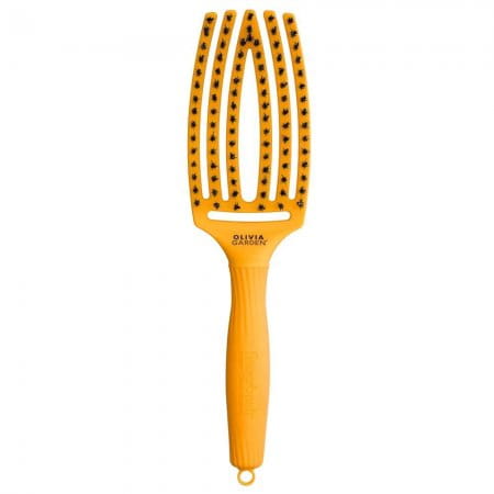 Szczotka Olivia Garden Fingerbrush pozwala na bardzo delikatne i skuteczne rozczesywanie nawet najbardziej opornych i grubych włosów. Specjalnie wyprofilowany kształt szczotki sprawia, że rozczesywanie włosów jest prawdziwą przyjemnością. W 100% włosie z dzika wygładza włosy podczas stylizacji oraz nadaje im połysk i objętość. W połączeniu z nylonowym włosiem skóra głowy jest delikatnie masowana. Unikalna antystatyczna technologia sprawia, że włosy nie elektryzują się podczas czesania i jednocześnie są chronione przed szarpaniem i ciągnięciem. Dzięki temu łuski włosa zostają domknięte pozwalając zachować właściwy poziom nawilżenia włosów oraz dodając im objętości i blasku.