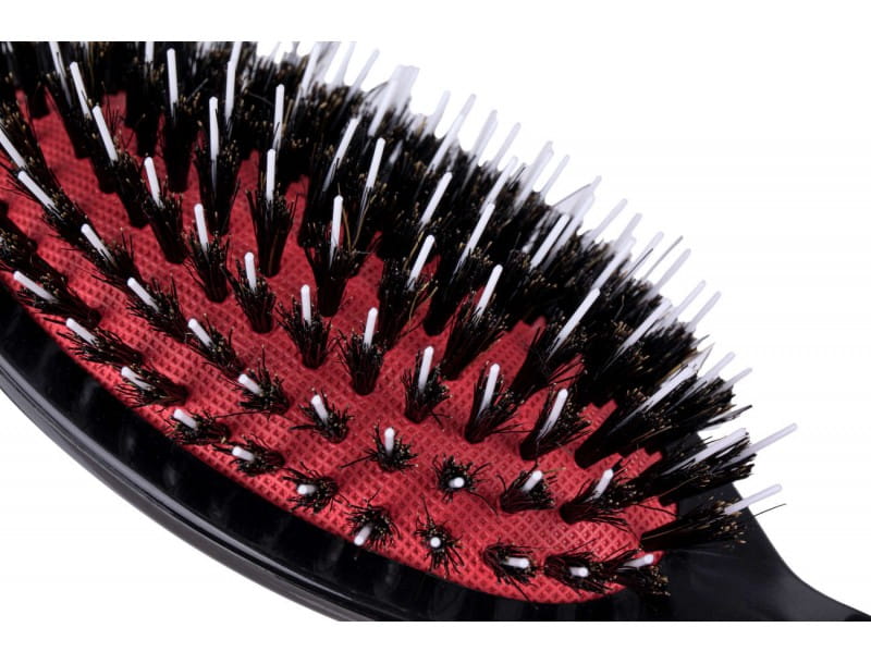 Szczotka w kształcie owalnym z prostą wyprofilowana rączką do kształtu dłoni. Korpus wykonany z wysokiej jakości błyszczącego tworzywa, sierść / włos naturalny z dzika umieszczony na pomarańczowej poduszce pneumatycznej z otworem odpowietrzającym. Dodatkowo wyposażona w rozczesywacz z białych igiełek ze specjalnego nylonu antystatycznego. Szczotka średnio twarda dedykowana do włosów przedłużanych jak włosów które maja tendencje do plątania, mechacenia. Idealna do codziennego użytku, nadaje się do czesania zarówno włosów długich, jak i krótkich.